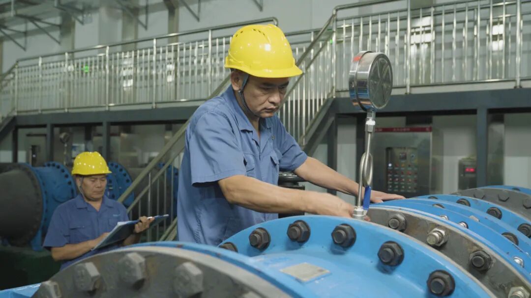 ? ? ? ?走進泵房深處,許師傅正俯身檢修水泵機組。安全帽下的發(fā)絲被汗水浸濕,臉頰上濺著黑色機油,工作服已洗得發(fā)白,肘部磨出毛邊——這些都是他二十年檢修生涯的印記。